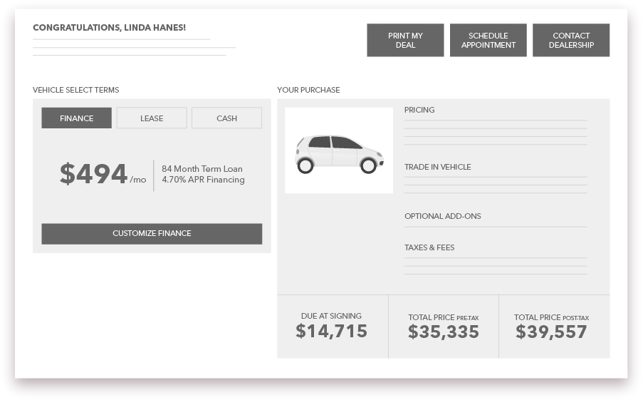 We'll add in all appropriate taxes and fees so there are no surprises at the dealership. You'll be able to see your finalized deal from the comfort of your own home.